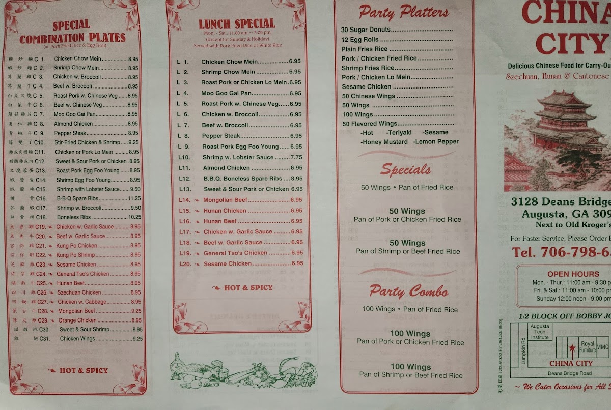 Nestled on Deans Bridge Road in Augusta, Georgia, China City offers a delightful expedition into Chinese cuisine. The extensive menu features a variety of steamed delights, including the delicious Steamed Seafood Delight for $17.95 and wholesome options like Steamed Shrimp with Mixed Vegetable, perfect for the health-conscious diner.